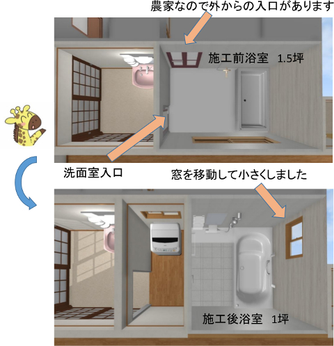 築50年の1.5坪の寒い浴室を、1坪のユニットバスと0.5坪の洗濯室に
